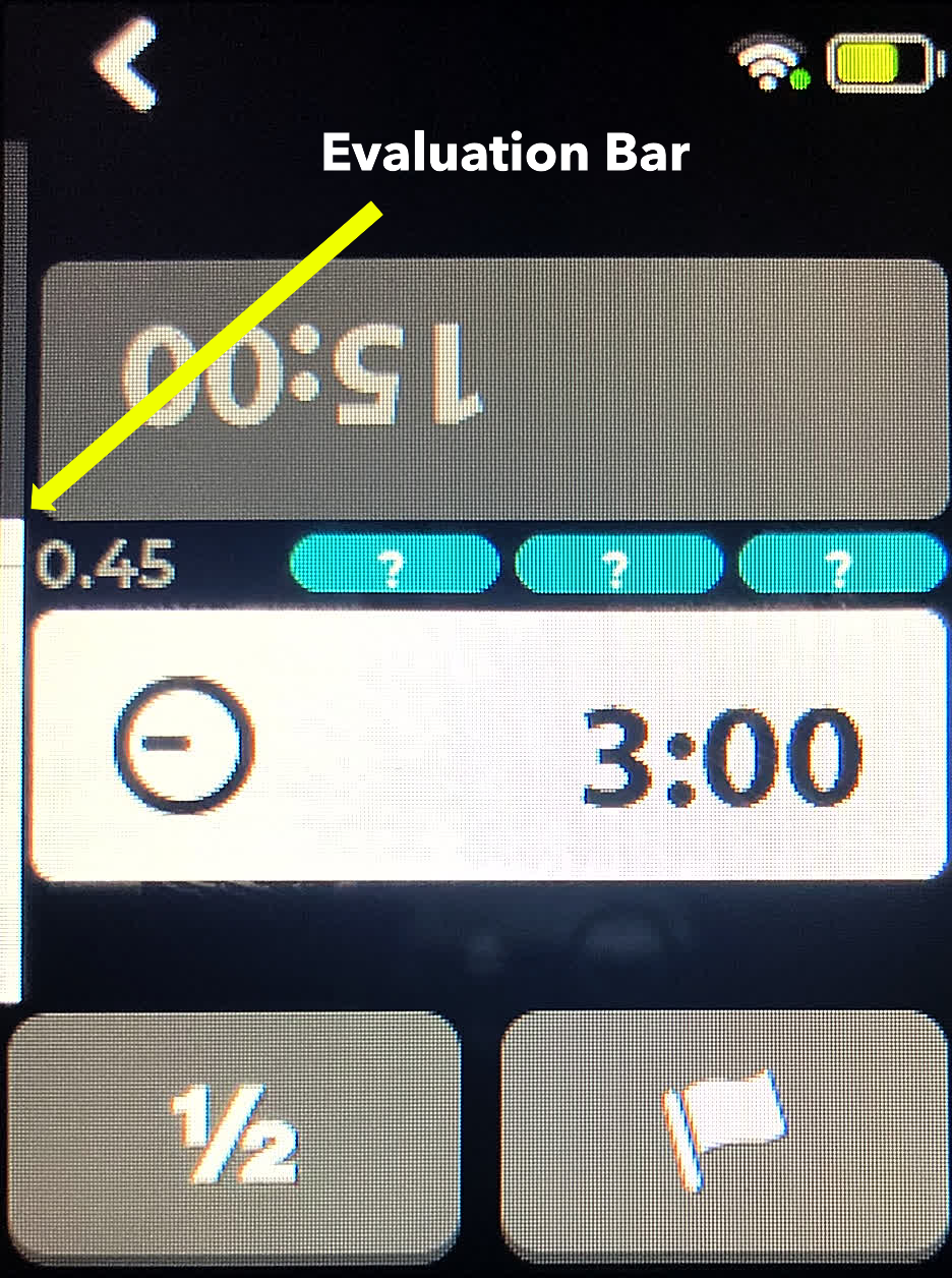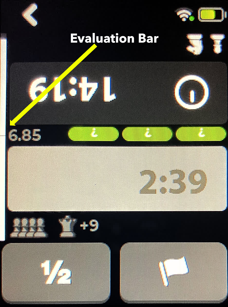 The Evaluation Bar is an option that can be turned on during the setup of a game. When it is enabled, it will be shown on the left side of the game screen as a black and white vertical scale.