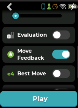 Move Feedback can be turned on or off on the game settings page for each game type. Your selection is saved and restored every time you start a new game, even after a power cycle.