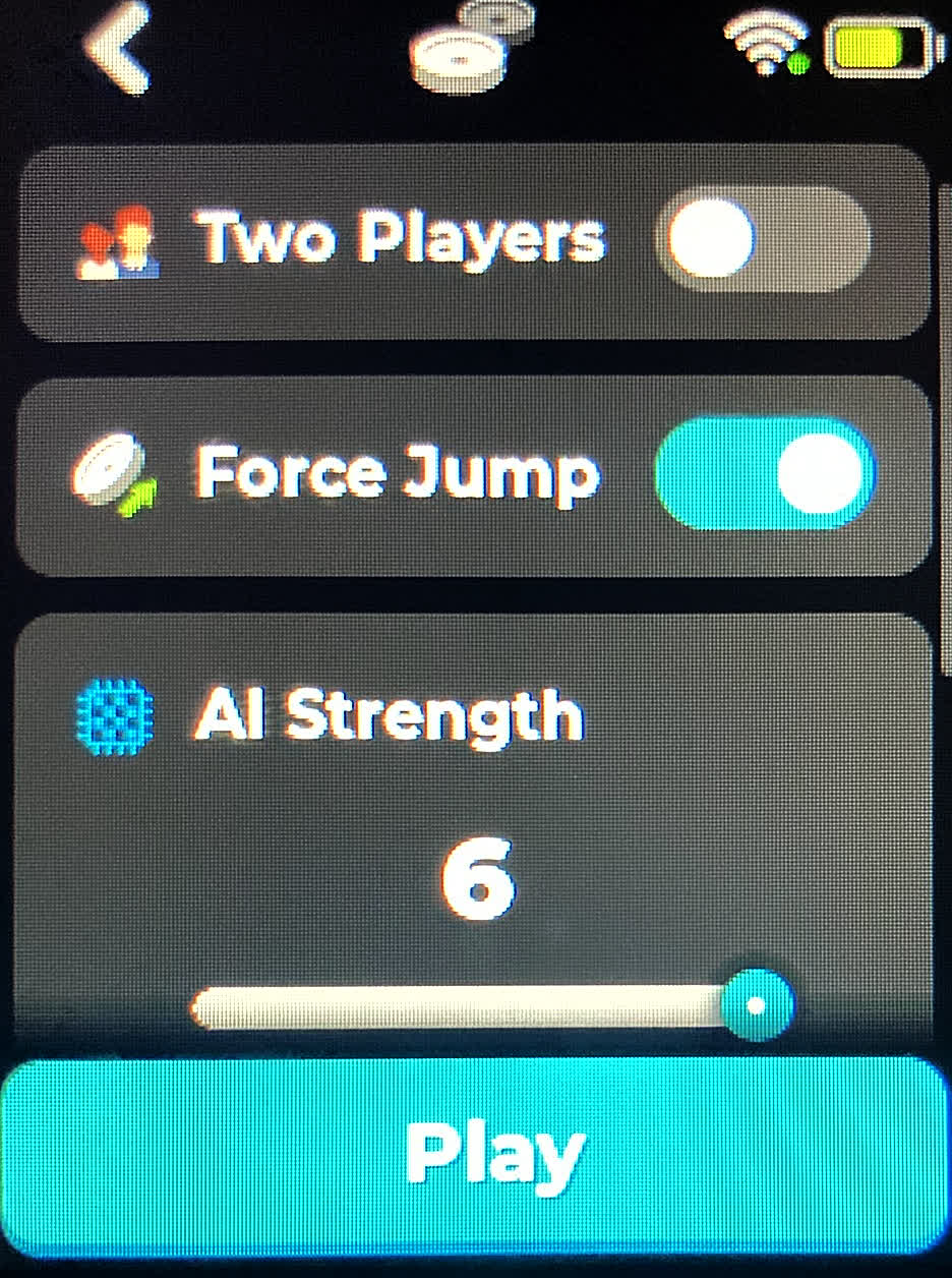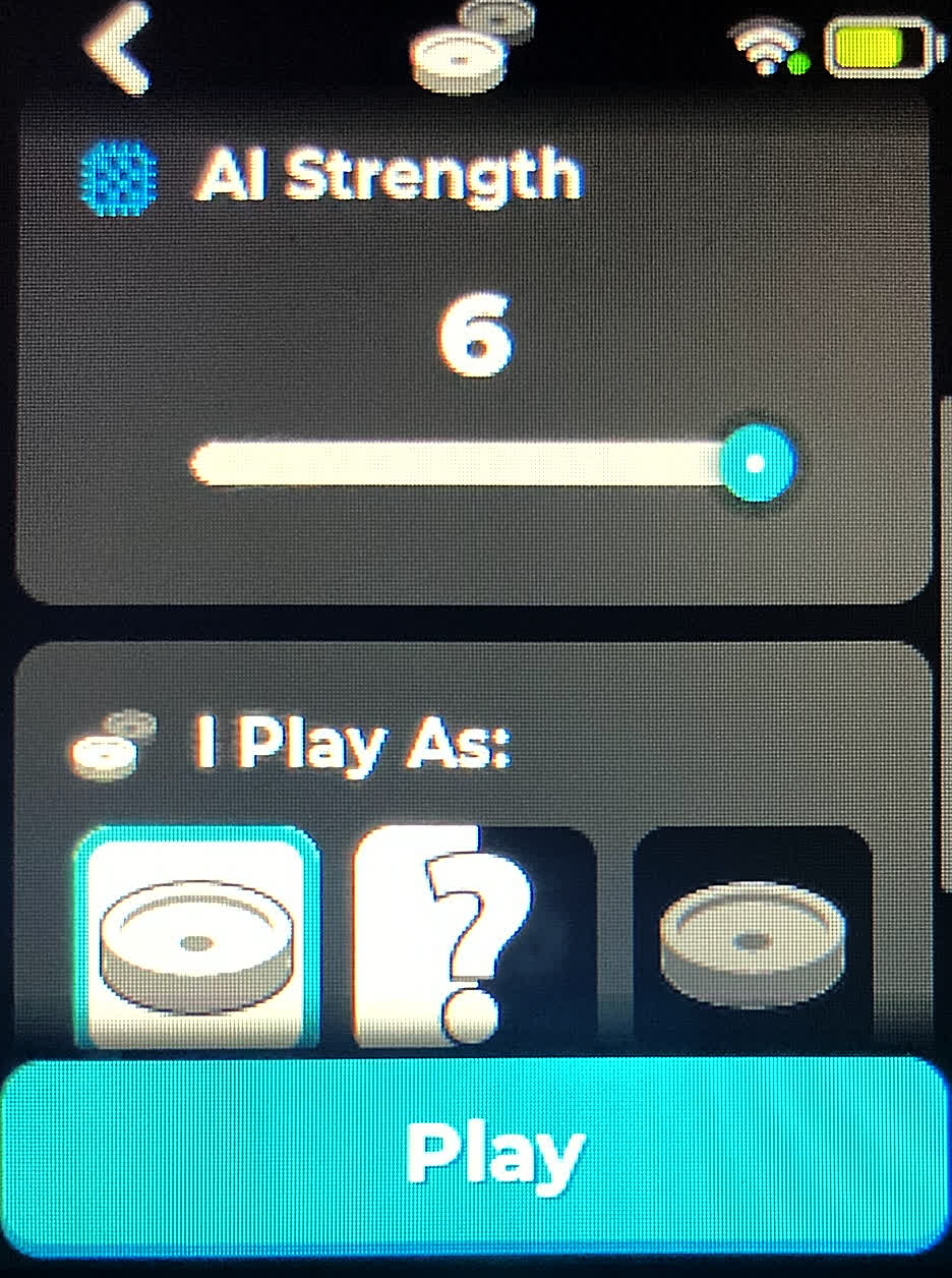 - If you choose to play the AI ("Two Player" toggle turned off), use the slider to select the strength of the AI. There are 6 levels from which to choose, with level 6 being the strongest.