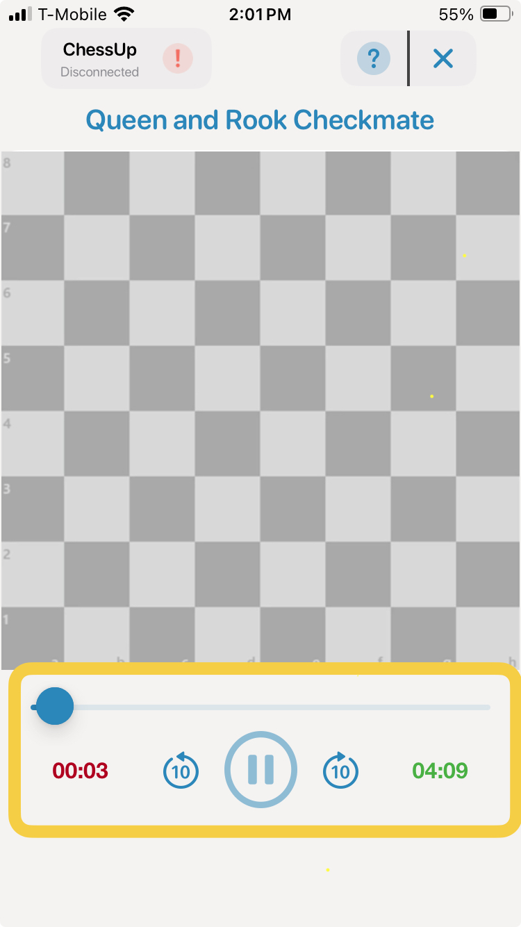 Time Controls: The app allows you to fast-forward or rewind to get to different times in the lesson. You can either use the rewind/fast-forward buttons or you can grab the scrub bar handle and drag it to a particular time. When you do this the video might automatically pause and light up the board indicating that you need to setup a position. Once you setup the position, the video will resume.