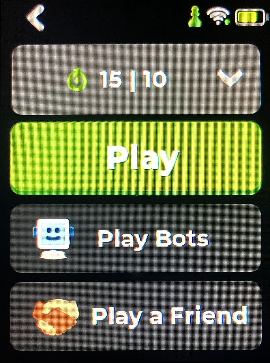 If you would like to Play a Friend, first access the Chess.com setup page by pressing the Chess.com button on the main screen. Then, press the "Play a Friend" button. This will take you to a list of your friends who are currently online. Select a friend from the list and press "Next."