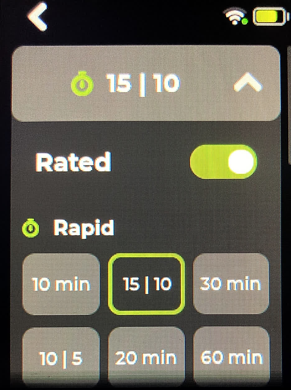 On the setup page, you can select the time format, rated or unrated game (found in the timer down menu), and what color you want to play. You can also have the color be randomly chosen by selecting the question mark icon.