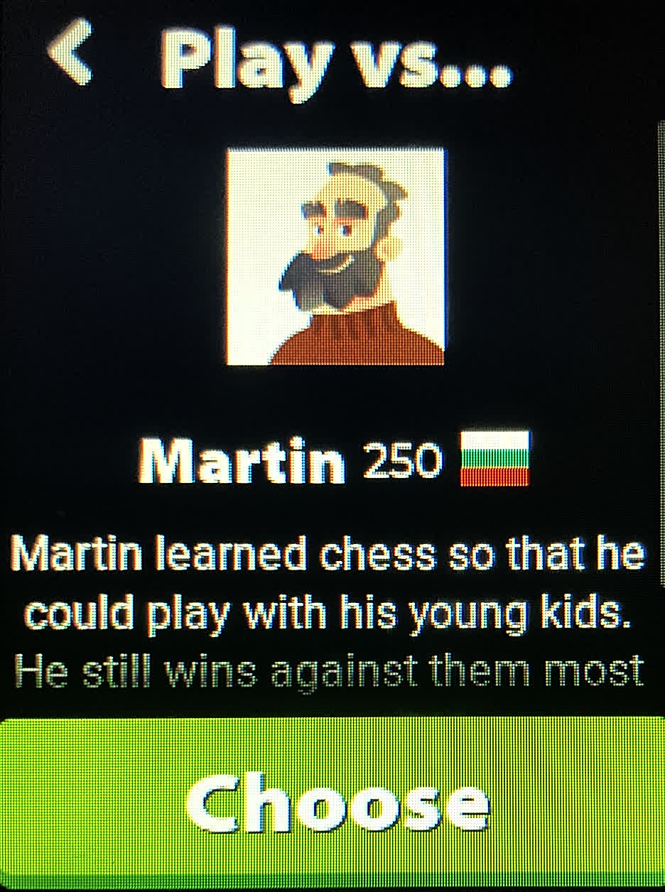 When you select a bot a page, it will provide you with more information about those bots. Here you can see the ELO rating of the bot, background, and country flag. If you wish to choose a different bot, you can hit the back arrow at the top of the screen. Otherwise, you can press "Choose" to continue game setup.