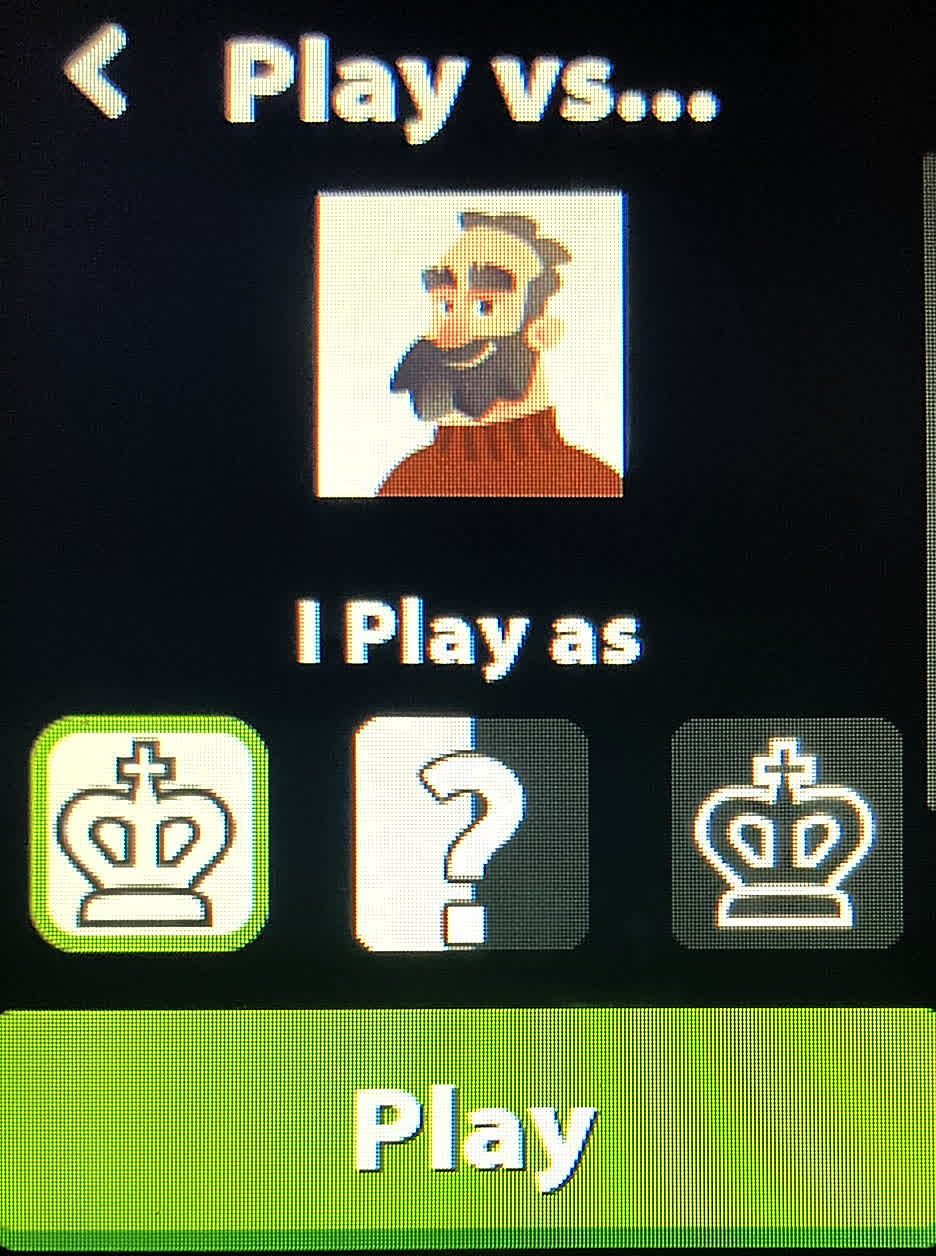 If you would like to set up a Random Play game, first access the Chess.com setup page by pressing the Chess.com button on the main screen. When you have done this, you will see the screen below.